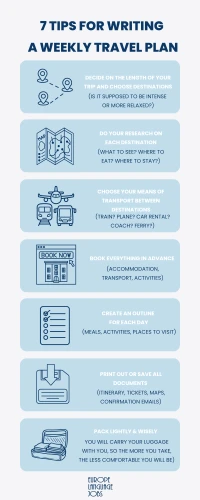 The same care should be applied when writing a weekly travel plan. Nobody will mark it, but how well it's prepared will influence how organised and pleasurable your trip will be. The more effort you put into it, the bigger the chances of avoiding stressing and improvising later on.